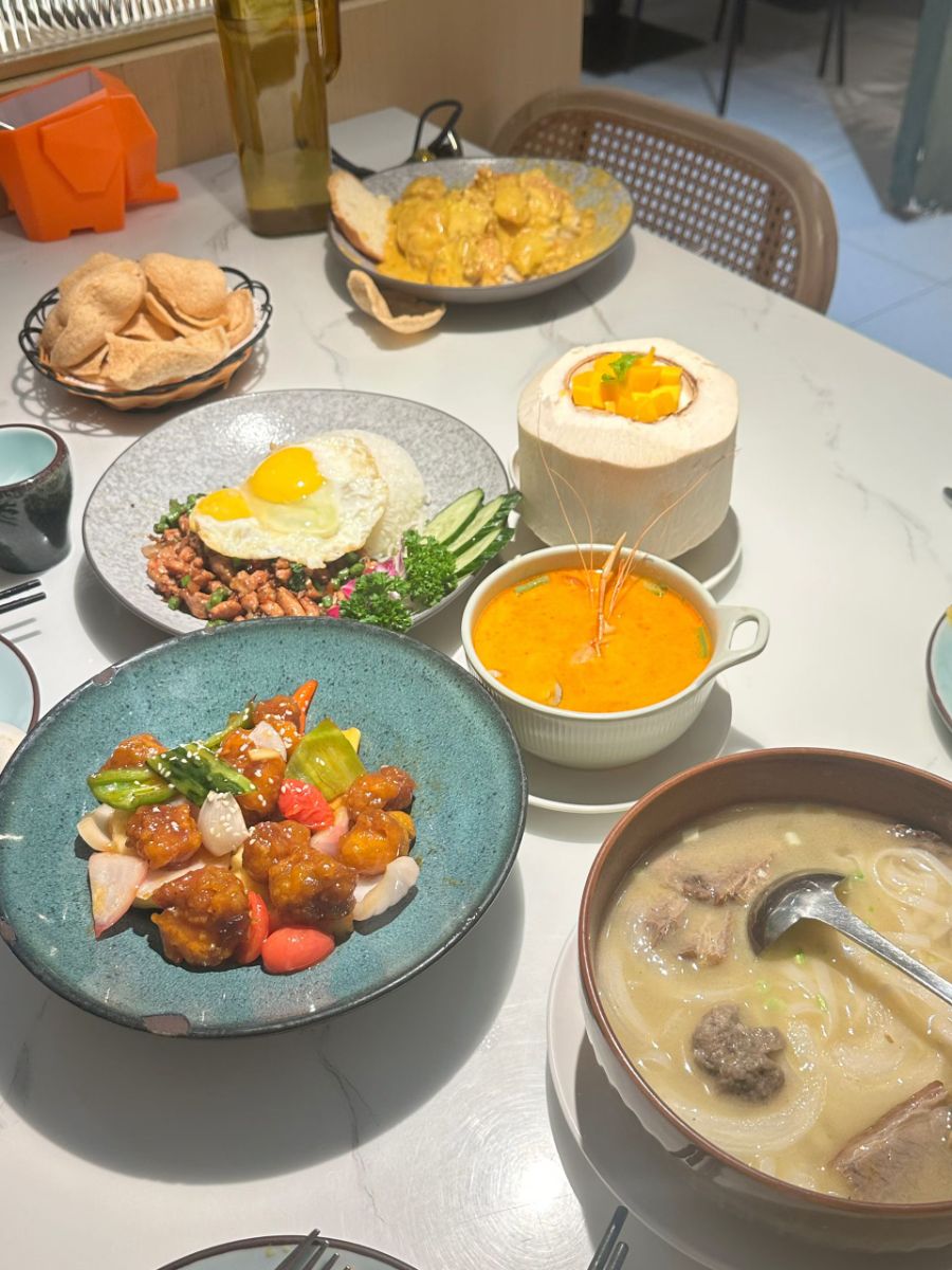 角落的虾片酥脆,远处的咖喱菜肴色泽浓郁,配上面包更显风味。暖光下,这些佳肴错落摆放,从酸辣到甜鲜,从主食到小食,每一道都在诉说着东南亚美食的多元与精致,让这场用餐,成了一场舌尖的环球旅行。