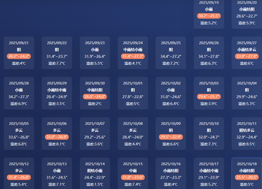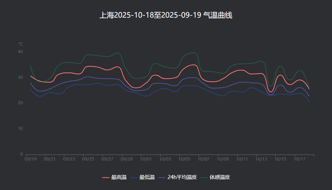 一、天气转折点:夏日“超长待机”后的凉爽序曲上海今年度过了158天的漫长夏季,自5月12日入夏以来,足足比常年提前了12天,成为了徐家汇站有记录以来史上第二长的夏天。在此期间,我们经历了54个高温日,高温日数之多位列1873年以来的第二。甚至连10月6日中秋当天都出现了35℃的高温,创下了“最晚高温日”的纪录。而转折点就发生在本周!周六(10月18日)开始,冷空气将使气温明显下降,周日(10月19日)起,本市日平均气温预计将连续5天低于22℃——气象学上真正的秋天终于要来了!周日和下周一早晨的最低气温甚至会跌至18-19℃,这与上周还感觉闷热的天气形成了鲜明对比。