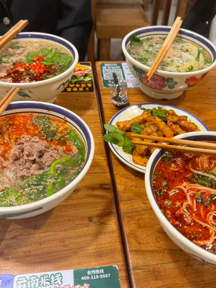 今天和朋友一起去尝了心心念念的云南米线。店里香气扑鼻,我们点了几碗不同口味的米线:有的麻辣鲜香,有的清淡爽口。我选了一碗牛肉米线,上面铺满了鲜嫩的牛肉片和翠绿的蔬菜。