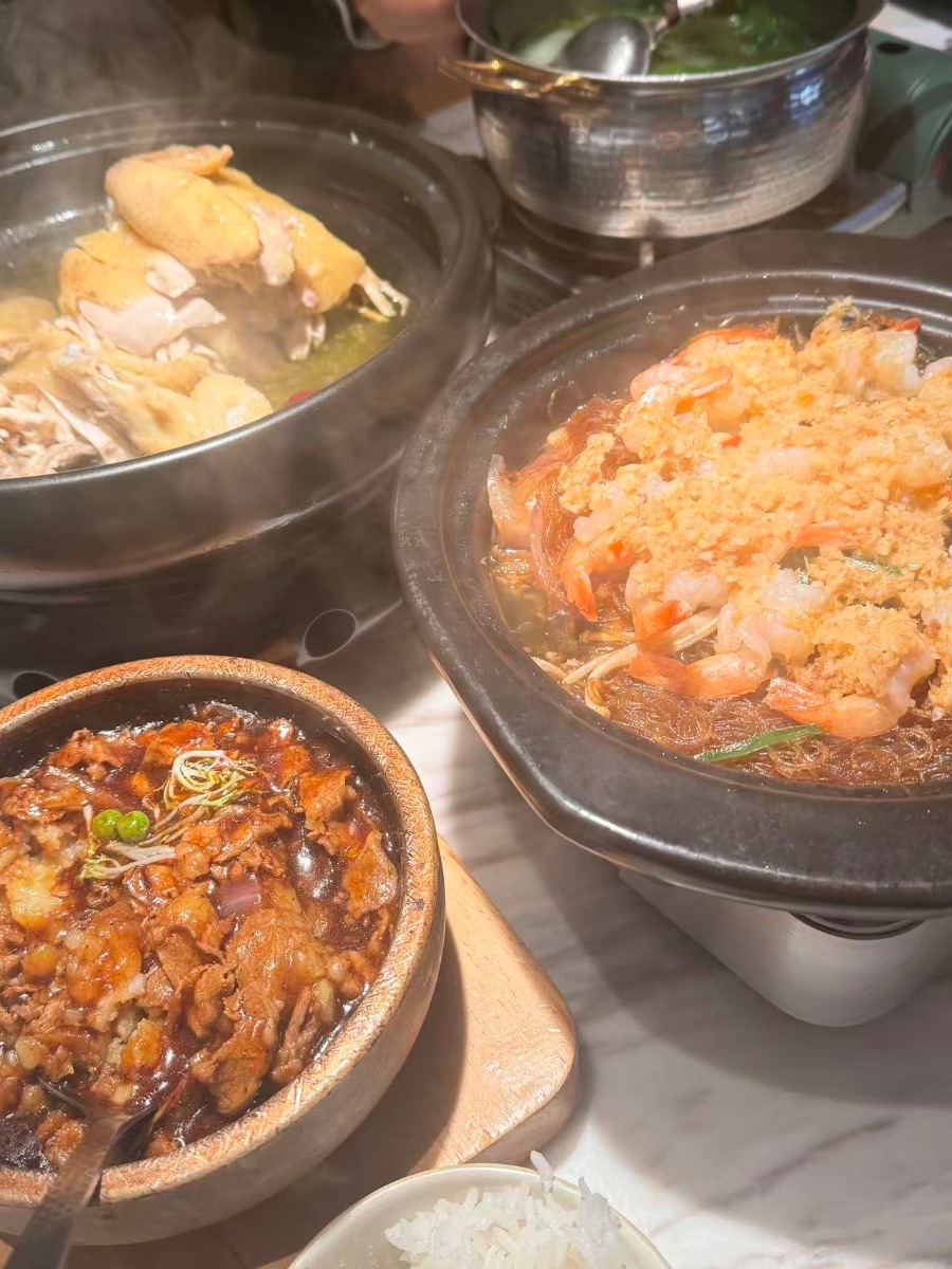 大家围坐在餐桌旁,一边品尝美食,一边聊天。砂锅鸡的汤汁浓郁,鸡肉鲜嫩;虾仁粉丝煲里的粉丝吸收了虾的鲜味,口感丰富;牛肉则嫩滑多汁,配上米饭更是美味。
