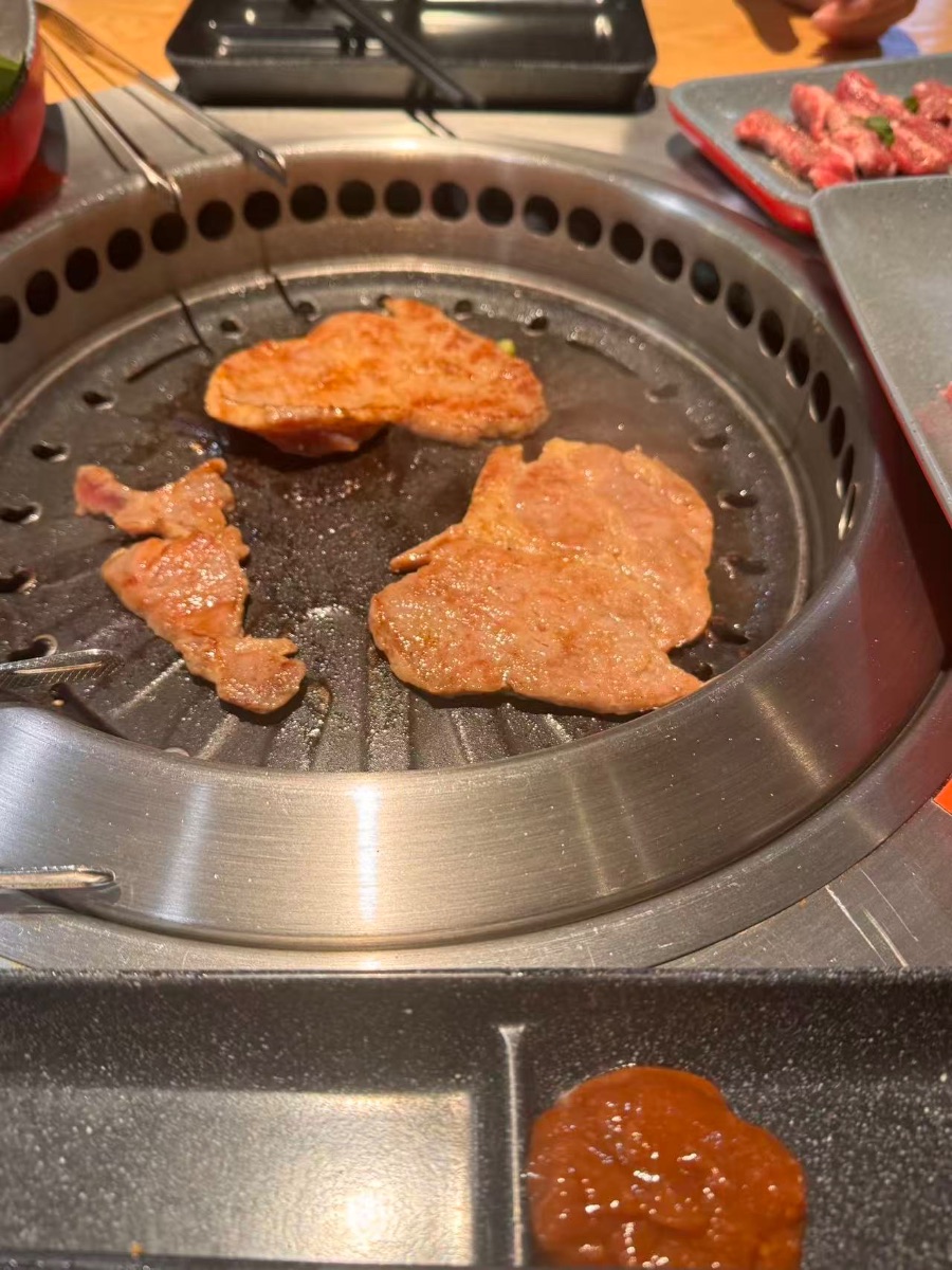 今天和家人一起去吃烤肉。餐厅里弥漫着肉香,我们点了各种肉类:牛舌、猪排、还有我最爱的五花肉。看着肉片在烤盘上滋滋作响,慢慢变成金黄色,我的口水都快流出来了。