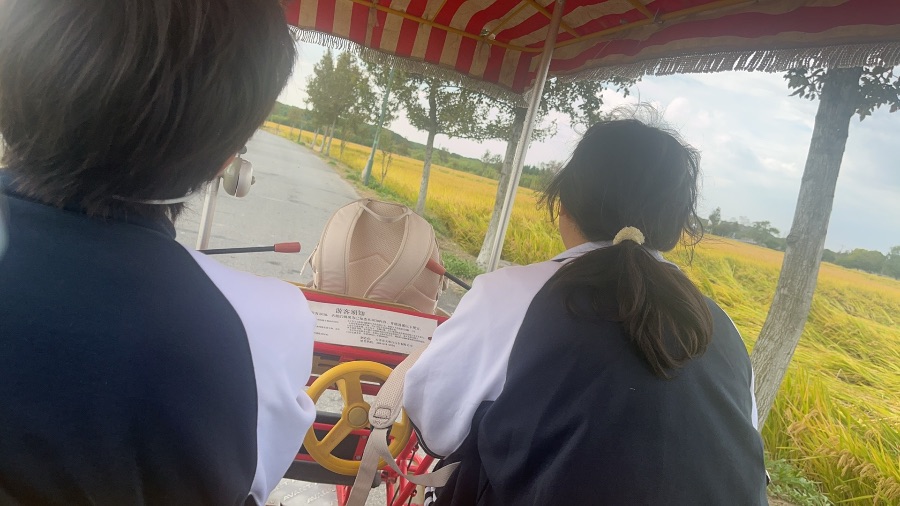 在这次的秋季社会实践活动我和,翘楚,修齐,愉迪,心血来潮租了一辆四人自行车在田野里悠闲的骑,在骑车的过程中我们看见了许多金黄的水稻,这使我们不由的放慢了脚步,但是集合的时间快要到了,而我们还要车,并且离还车地点大约还有1千米的距离,于是我们经历了一番惊心动魄的还车故事,终于在离集合,还剩下15分钟的时候到达了还车地点把车还了,再跑回去的途中遇到了热心大巴司机把我们载上了车送到了离集合地点不远处,这使我们在1:00前到达了集合地点