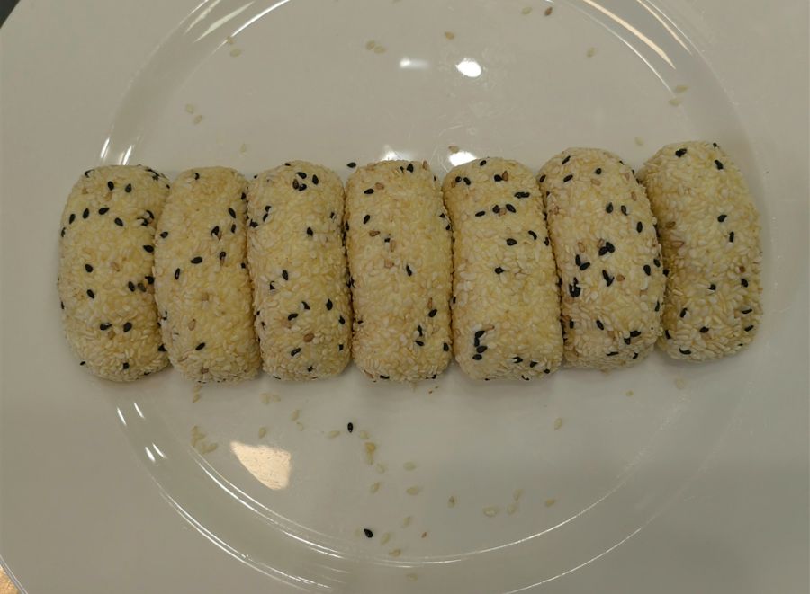 4. 塑形裹芝麻:面团分成20g/个的小剂子,搓成均匀圆球,放入白芝麻中滚一圈,确保表面均匀裹满芝麻(可轻轻按压固定)。