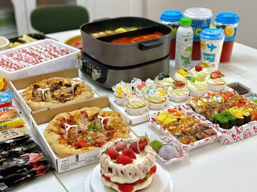 这张餐桌像是被快乐填满的百宝箱,每一处角落都堆着让人眼馋的美食,光是看着,心底就涌起满满的幸福感。黑色的鸳鸯电煮锅稳稳立在桌中,红汤的辣香与清汤的鲜醇丝丝缕缕飘散开,锅边还摆着满满一盒粉嫩的肉片,仿佛下一秒就能涮出滚烫的鲜香。旁边的披萨盒里躺着两款诱人的披萨,一款铺着焦香的培根与爽脆的彩椒,芝士的香气仿佛要穿透纸盒,另一款裹着浓郁的肉酱,饼边烤得金黄焦酥,轻轻一碰就能感受到酥脆的质感。