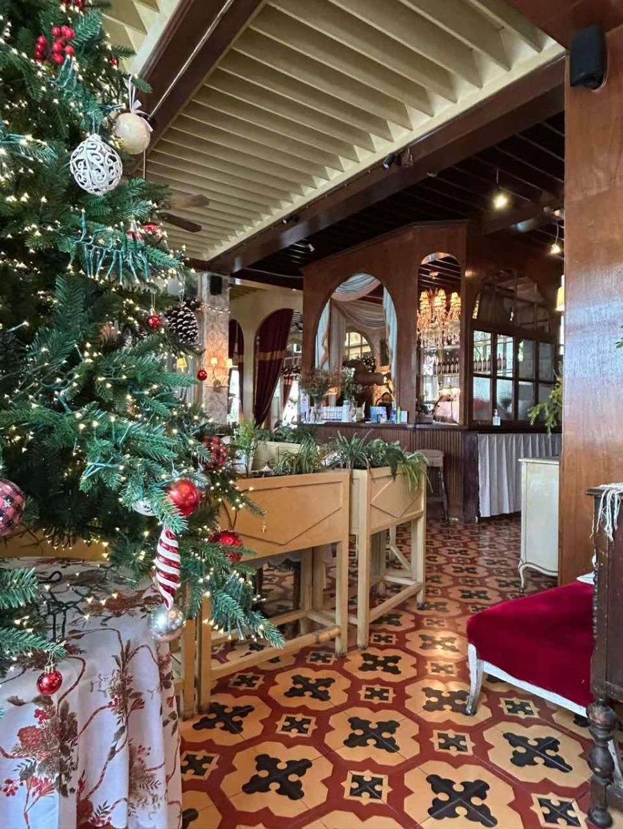 绿植被栽种在木质花箱里,鲜绿的枝叶为深沉的复古色调添了几分生机。在这里,圣诞的热闹与复古的静谧完美相融,哪怕只是倚着红丝绒座椅静坐,听着隐约的圣诞乐曲,看着光影在梁柱间流转,也会觉得时间都慢了下来,只想沉浸在这份温暖又慵懒的氛围里,享受这片刻的美好。