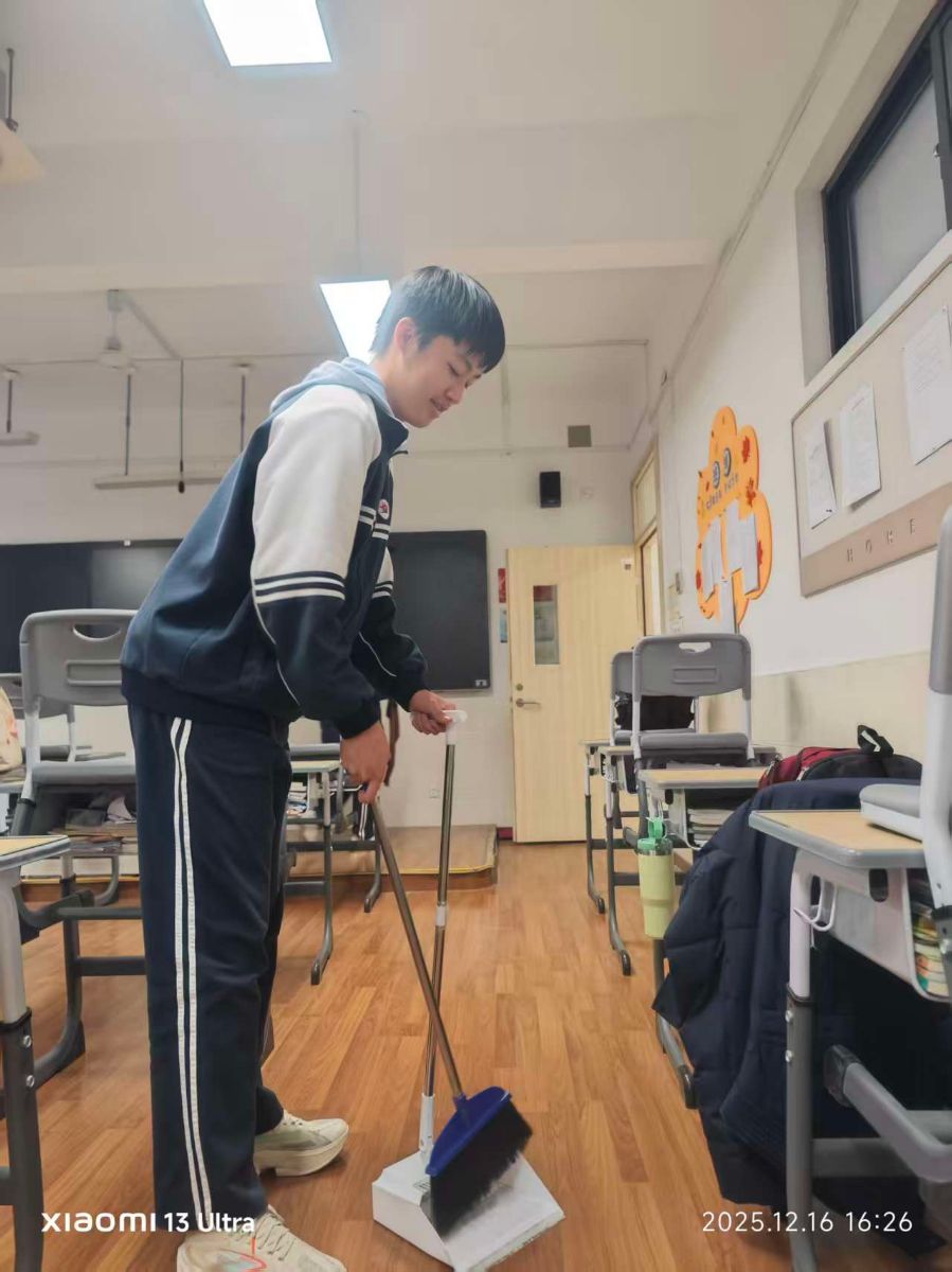 有人拿起扫帚,弯着腰仔细清扫地面的纸屑和灰尘,不放过任何一个角落;有人拎着拖把,蘸水后认真擦拭,让原本有些斑驳的地板重新焕发光泽;还有人负责整理桌椅,将歪歪扭扭的板凳一一归位,让教室恢复整齐的模样。
