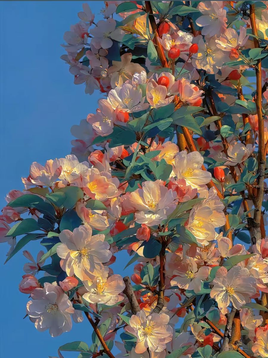 海棠原产中国,雅号“花中神仙”,《诗经·卫风》已咏其“投我以木桃”。唐明皇曾将杨贵妃醉颜比作“海棠春睡”,自此成就“国艳”之名,与牡丹、梅花并称三大观赏花。宋代《海棠谱》记蜀地品种最盛,成都“西府海棠”色若胭脂,北京“垂丝海棠”花梗低垂如丝,皆沿丝绸之路传至波斯、欧洲。其花姿潇洒,却耐旱抗寒,象征富贵而不娇。花语“温和”“苦恋”“游子思乡”,文人常借海棠写离愁,苏轼“只恐夜深花睡去”尤传。如今南北园林皆植,春日一树千花,似云似霞,提醒:无论漂泊何处,故土终是归心。