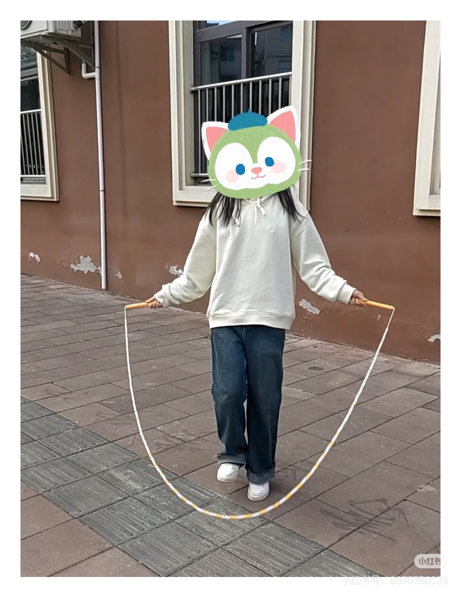 一开始,我总是跳几下就绊住,绳子老是缠在脚上。我没有灰心,调整姿势,手腕轻轻摇绳,双脚轻轻跳。慢慢地,我越跳越熟练,一口气能跳好多个了。