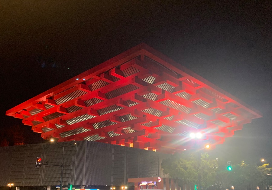 夜色里的中华艺术宫,以“东方之冠”的雄浑姿态矗立在黄浦江畔。这座由2010年上海世博会中国馆改建而成的艺术殿堂,通体朱红的斗拱结构层层叠叠,复刻了中国古代木构建筑的力学与美学,在灯光下如燃烧的火焰,诉说着东方文明的沉稳与力量。