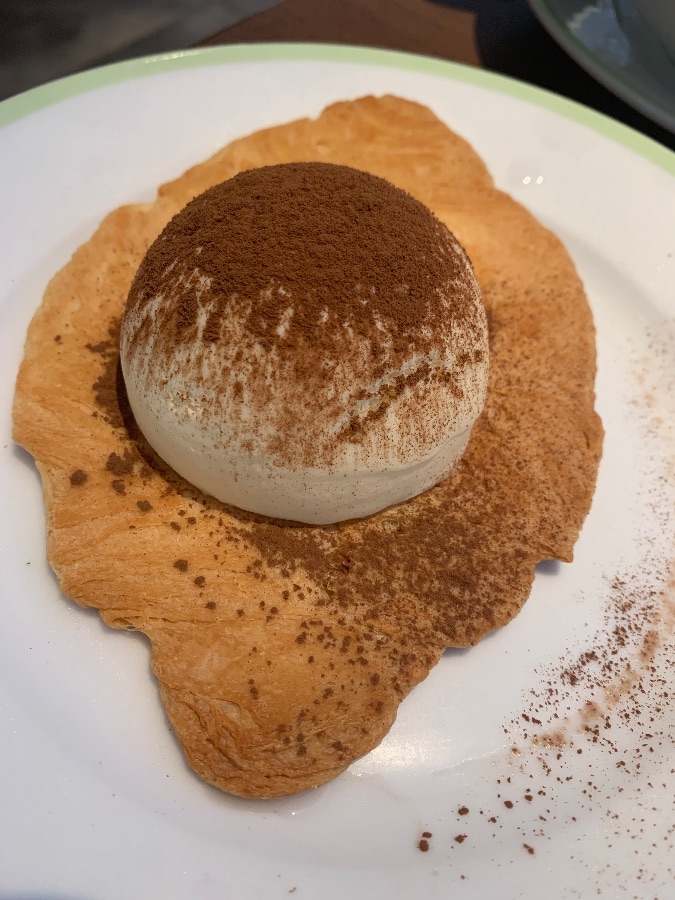 瓷盘以浅绿细边勾勒,一块被轻轻压平的金黄酥皮舒展其上,托着一颗圆滚滚的奶白色慕斯。表面均匀筛着深褐可可粉,深浅交织间像落了层细腻的雾霭,边缘还带着些许自然的晕染,视觉上透着几分精心打理的精致感,让人初见便生出几分期待。